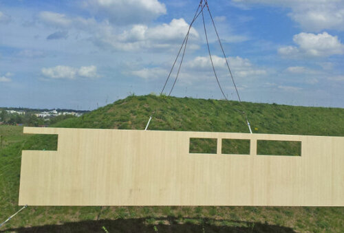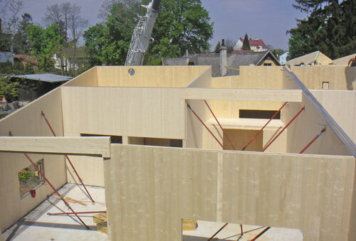 Brettsperrholz ist ein Massivholz-Bauprodukt aus mindestens drei Lagen kreuzweise verklebter Einschichtplatten in Raumhöhe und bis zu Längen von mehr als 16 m produzierbar.