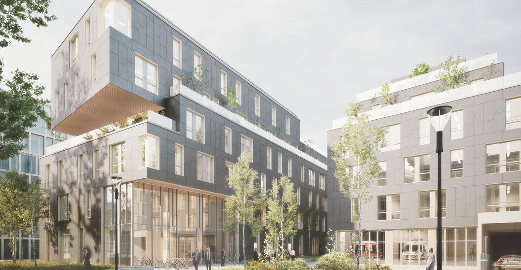 - 5-6 Obergeschoße in Holzhybrid-Bau und 3 Untergeschoße