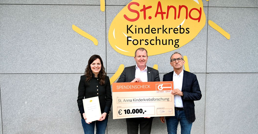 Leyrer + Graf sieht sich seit jeher in der Verantwortung, gesellschaftlich wirksame Projekte zu unterstützen. Die Zusammenarbeit mit der St. Anna Kinderkrebsforschung steht dabei seit vielen Jahren ganz besonders im Mittelpunkt. Für den Betrieb des Forschungsinstituts werden jährlich mehr als zehn Millionen Euro benötigt – eine Summe, die ohne Basisfinanzierung durch die öffentliche Hand ausschließlich durch Spenden und Fördermittel gedeckt werden muss. Vor diesem Hintergrund setzt Leyrer + Graf bewusst ein Zeichen und bekennt sich zu einer verlässlichen und treuen Partnerschaft. Geleitet von der Überzeugung, dass jede Spende ein Stück Hoffnung schenkt, überreichte CEO Dipl.-Ing. Stefan Graf kürzlich an die St. Anna Kinderkrebsforschung einen Scheck in Höhe von € 10.000,- an die Institutsleiterin Univ.-Prof. DDr. Caroline Hutter und den Kaufmännischen Direktor Mag. Jörg Bürger, MBA.