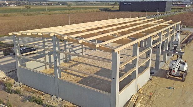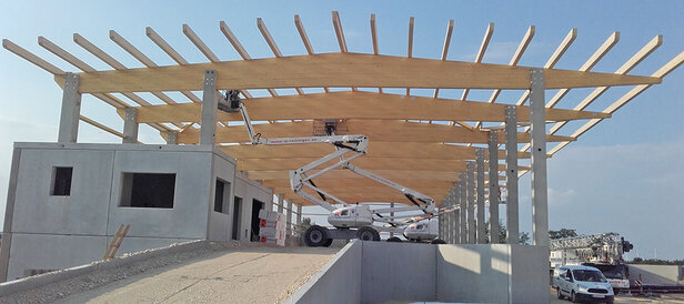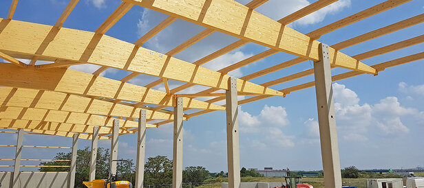- Satteldachförmige Leimbinder (Längen bis 25 m) auf Stahlbetonstützen aufgelagert