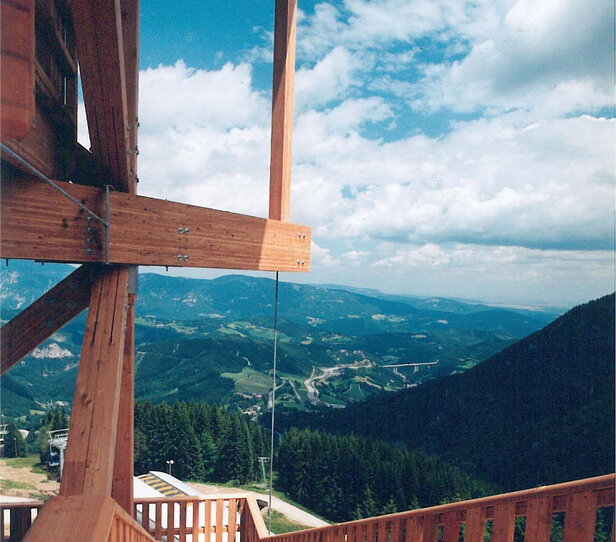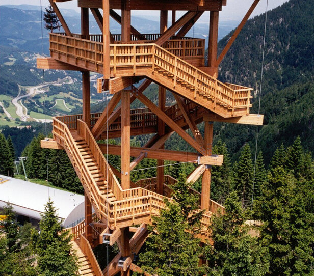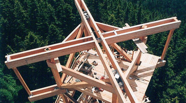 - Turmanlage (30,5 m hoch) aus vertikal und diagonal angeordneten Lärchen-Brettschichtholz-Stäben und Stahlzugstangen