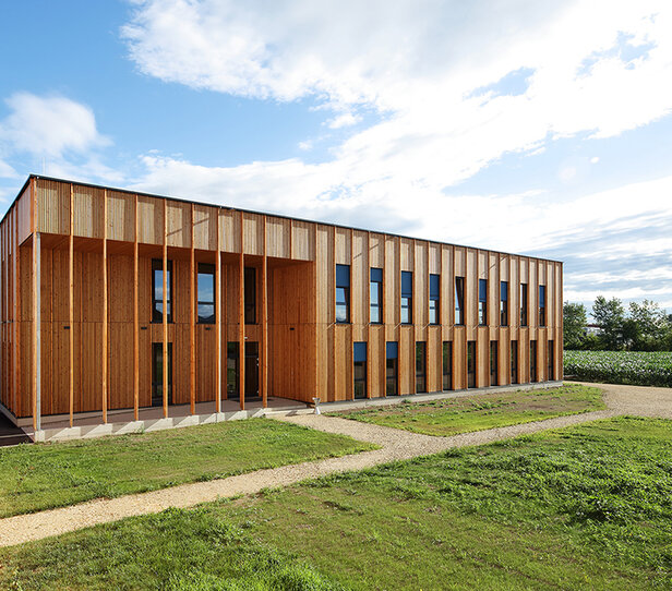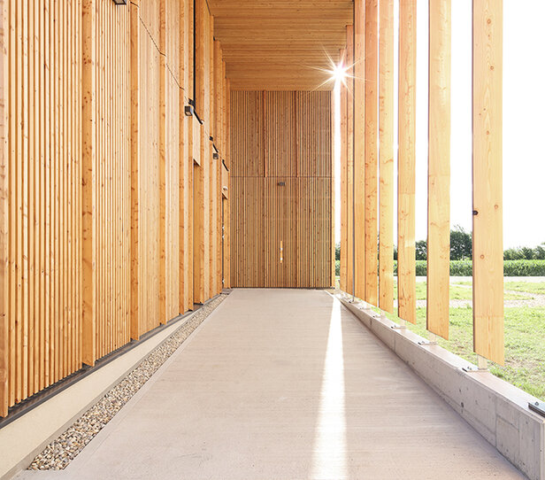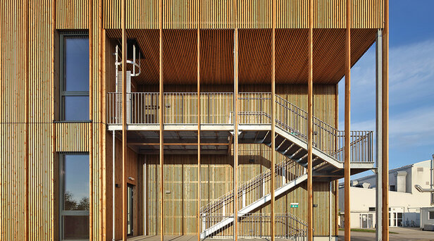 - Herstellung einer gedämmten, hinterlüfteten Fassadenkonstruktion aus Lärche (1.150 m²)