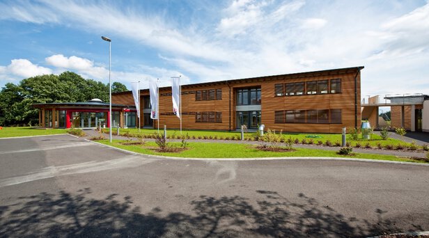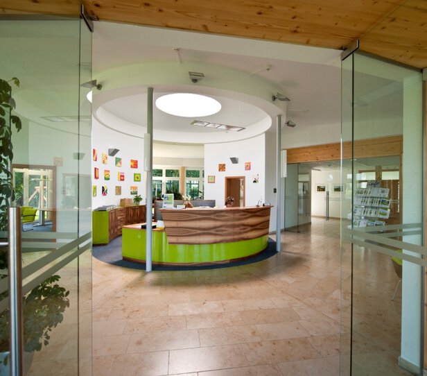 - Brettschichtholz(BSH)-Stützen aus Fichte mit Isolierglas-Fensterelementen und drei Wandverbandsauskreuzungen zur vertikalen Aussteifung