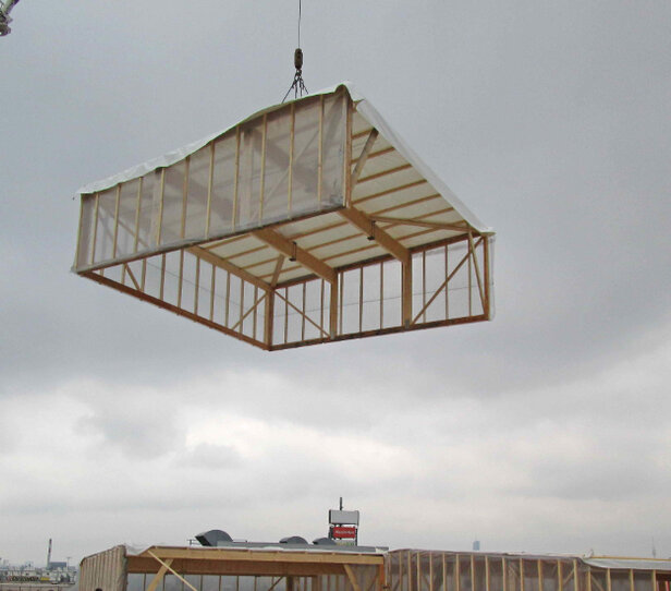 - Bestehende Dacheindeckung wurde demontiert, die obere Platte der Holzelemente sowie die Wärmedämmung dazwischen komplett entsorgt und die beschädigten tragenden Teile mit neuen Hölzern verstärkt