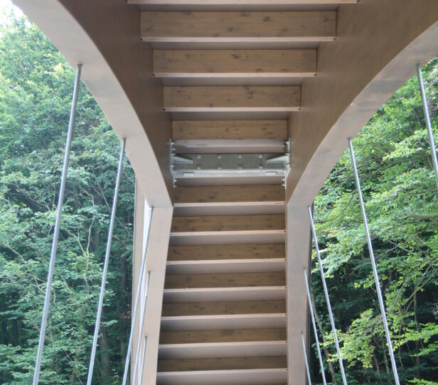 - Vorfertigung der Bögen inkl. Dach aus Fichten-Dreischichtplatten in zwei Teilen und der Fahrbahnelemente inkl. Geländer in 4 Teilen