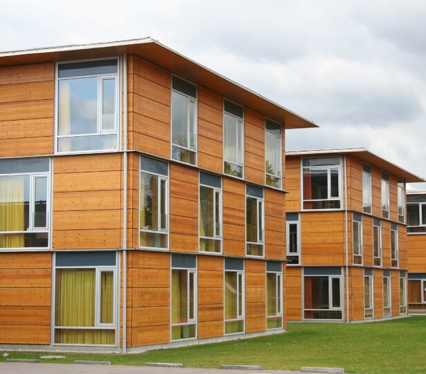 - Herstellung einer 13.000 m² Außenwandkonstruktion aus Holzfertigteilen mit unterschiedlicher Fassadengestaltung der einzelnen Gebäudeteile:
