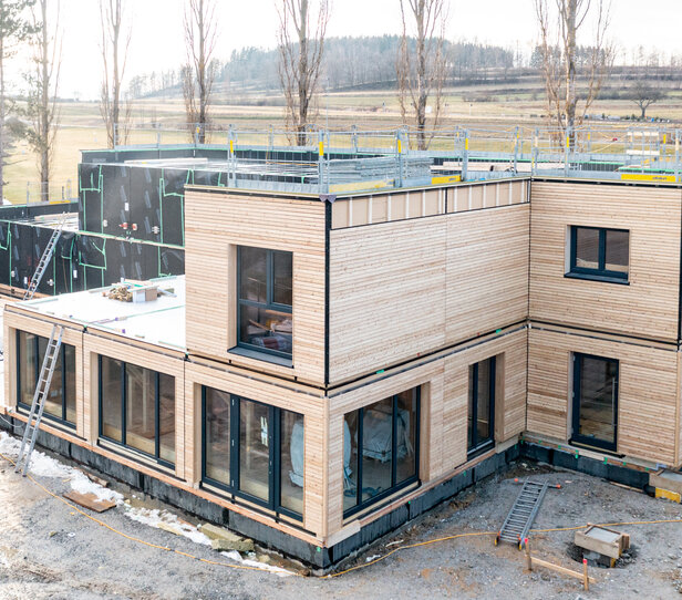 - Vorfertigung der 30 Module im eigenen Werk umfasst die komplette Außenhülle inkl. Fenster, Türen, Holzfassade und Dachabdichtung