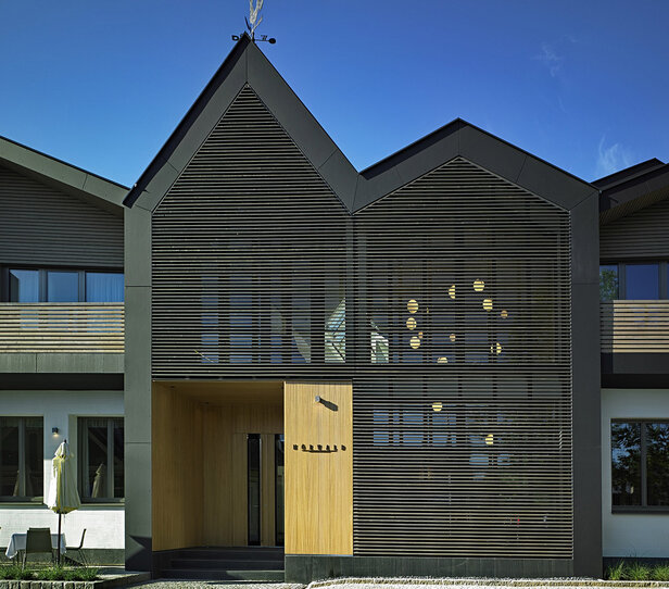 - Großzügige Glasflächen und überdachte Balkone für alle Zimmer durch vorspringende Dächer an der nordseitigen Fassade
