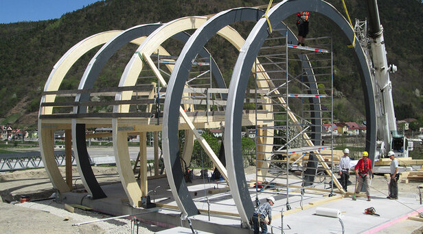 - Kreissegmentförmiger Querschnitt mit Holztragwerk, Blechdach und stirnseitigen Holz-Riegel-Fassaden