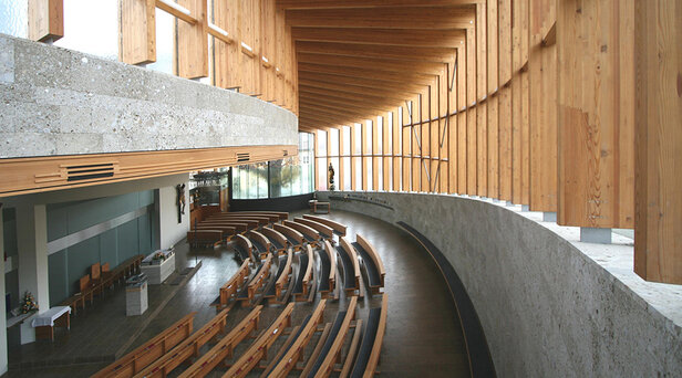 - Raum der Pfarrkirche besteht aus massiven Wänden und einer sich fächerförmig auffaltenden Rahmenkonstruktion aus Brettschichtholz