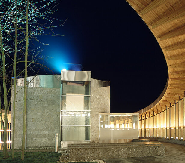 - Errichtung des über einem elliptischen Ring geformten Baukörpers des hohen Teiles des Kirchenraumes sowie der anschließenden Vordachkonstruktion aus strahlenförmig angeordneten Rahmen aus Brettschichtholz
