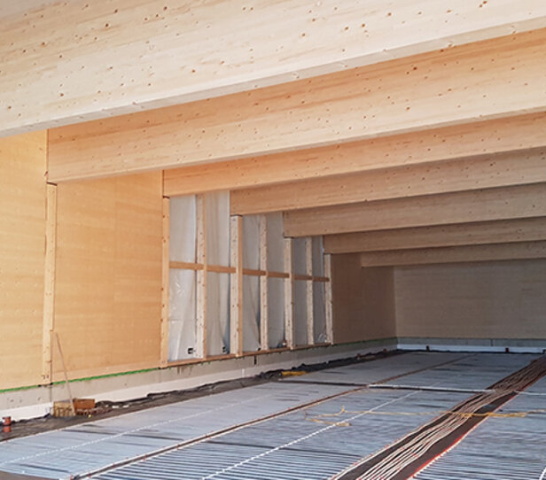 - 330 m² Außen- und Innenfertigwandelemente mit Fichten 3-Schichtplatten Beplankung