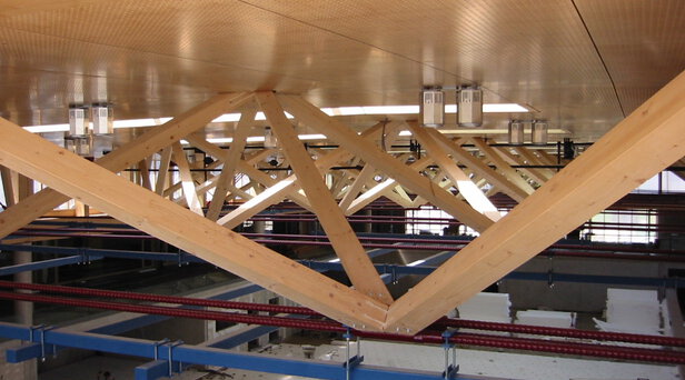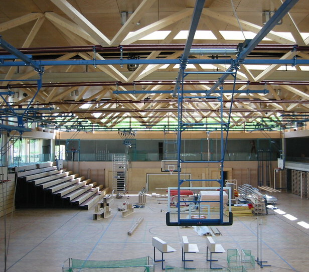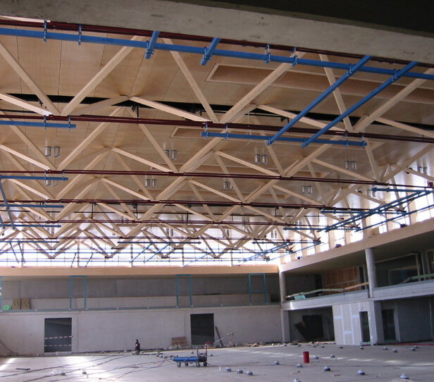 Errichtung der Dachkonstruktionen der 1.300 m² Turnhalle samt Anbauten (Tribünen, etc.)