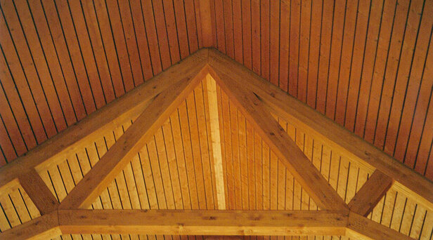 - Dachuntersicht aus Fichtenbrettern mit Fugen und hinterlegtem Akustikflies verleiht dem Raum Harmonie und Wärme