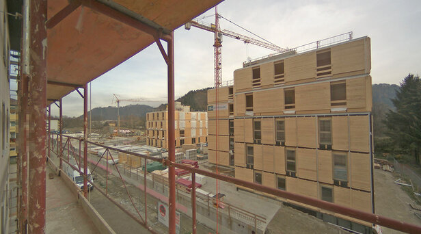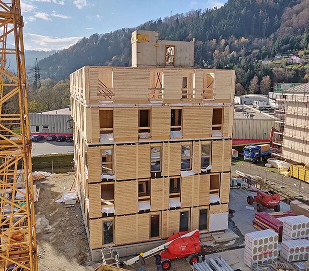- Verarbeitung von 1.850 m³ Brettsperrholz (Wände und Sichtdecke)