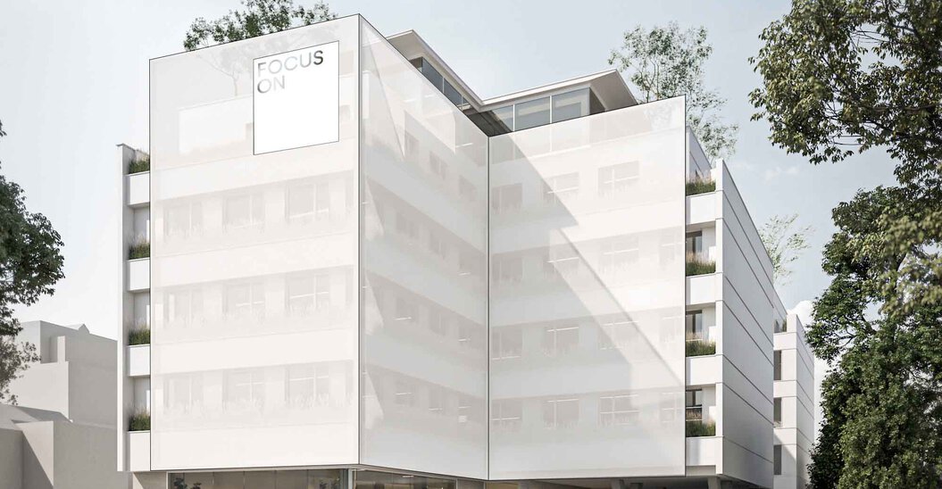 Das Bürogebäude "Focus ON" vereint nachhaltige hybride Holzbauweise mit modernem Design. Die zur Straße ausgerichtete Fassadenmembran, ergänzt durch eine grüne Filterebene, verbessert die Luftqualität und dämpft den Schall – für ein ideales Arbeitsumfeld.