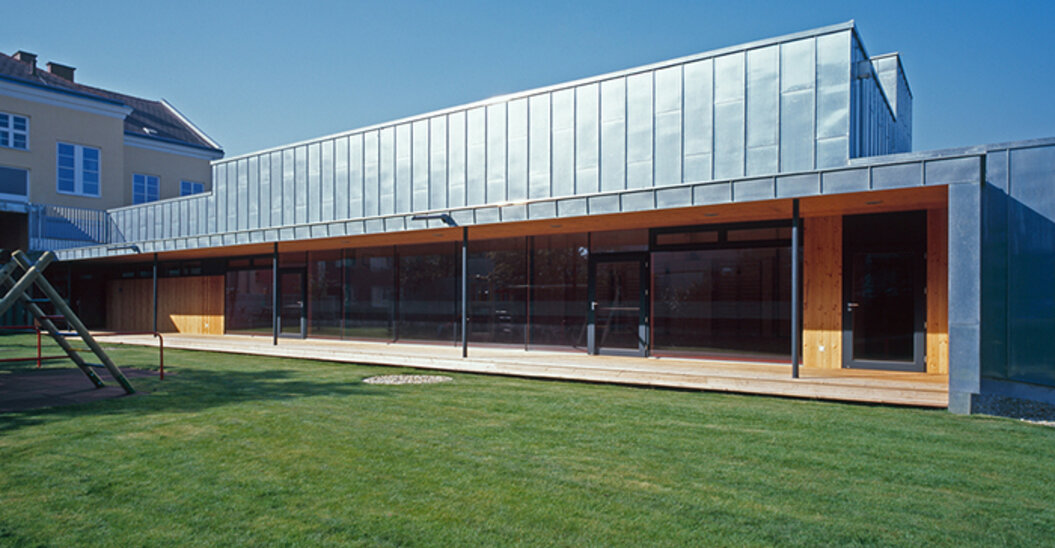 Zur bestehenden Volksschule wurde ein Zubau für einen Turnsaal errichtet. Der Turnsaal mit breiter Fensterwand bildet ein Zusammenspiel mit dem davor liegenden Freiraum als Anbau zu einer traditionellen Gründerzeitschule.