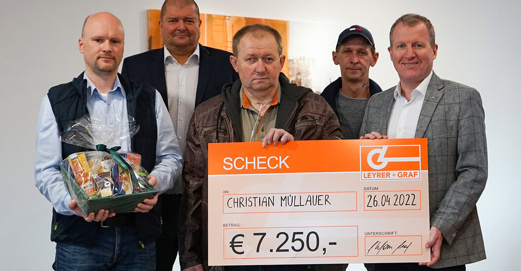 Tief betroffen von dessen Schicksal stellte die Unternehmensleitung einen Betrag von € 7.250,- zur Verfügung, die an Christian Müllauer durch CEO Stefan Graf symbolisch durch einen Scheck übergeben wurde.